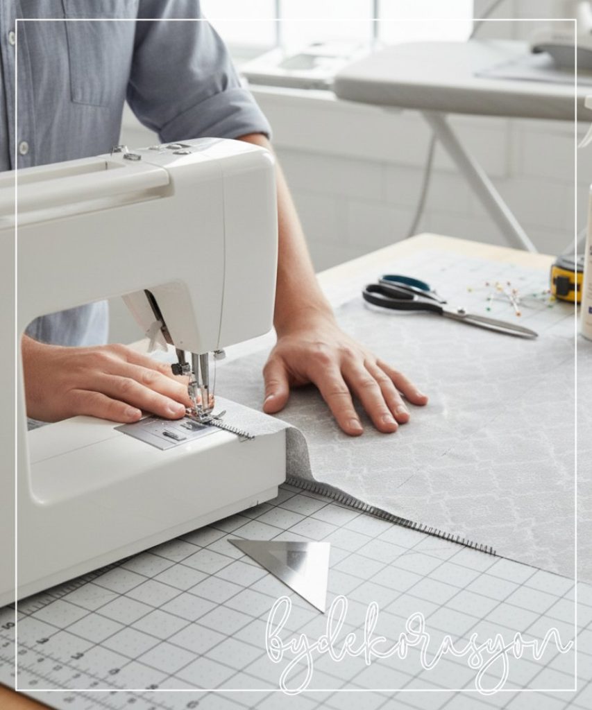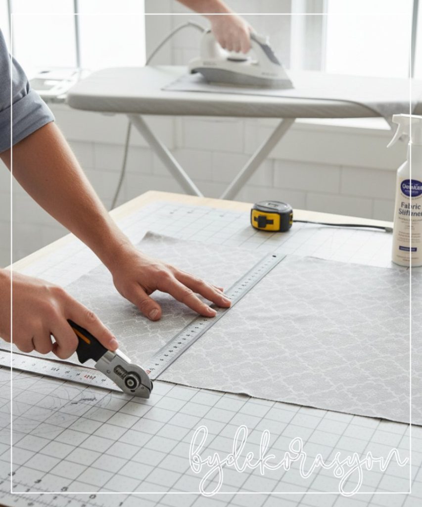 Bu, perdenin yamuk sarılmasına neden olabilecek en yaygın sorundur. Kumaşın tam olarak “kare” (90 derecelik açılarla) kesilmesi çok önemlidir. Bunu sağlamanın en iyi yolu, kumaşı büyük, düz bir zemine yaymak ve bir cetvel yerine, uzun bir “gönye” (T-square) veya L cetveli kullanarak kesim çizgilerinizi çizmektir. Eğer kumaşınız hafifçe bile yamuk kesilirse, sarılırken bir tarafa doğru kayma yapacaktır.