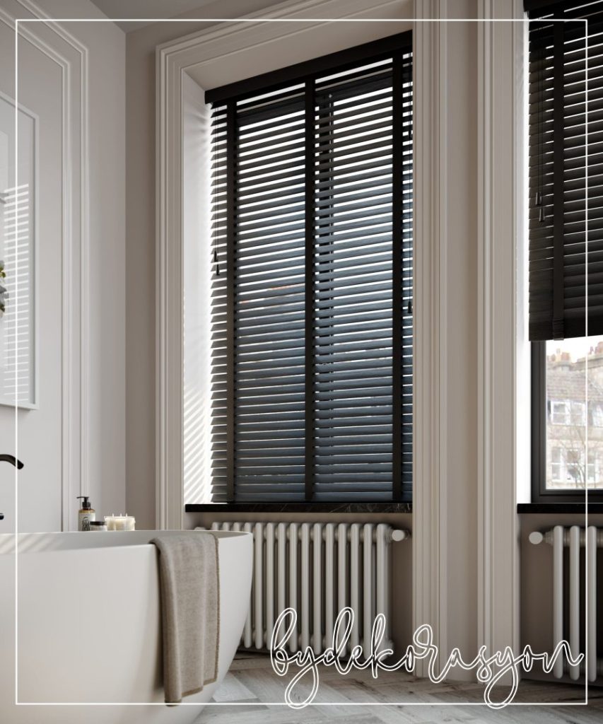 Metal (alüminyum) veya suni ahşaptan yapılmış Venedik perdeler, banyolar için en pratik banyo jaluzi seçeneklerindendir. Ayarlanabilir yatay çıtaları, mahremiyet ve ışık kontrolü konusunda size tam bir esneklik sunar. Işığı içeri alırken, dışarıdan görünmeyi engelleyebilirsiniz.