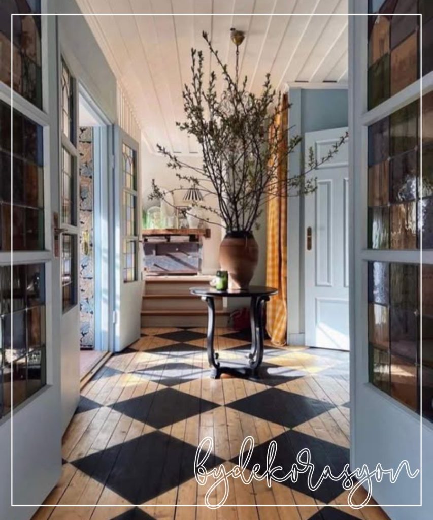 Dar bir koridoru olduğundan daha geniş hissettirmenin en etkili yollarından biri, dikkati zemine çekmek ve gözü yanlara doğru yönlendirmektir. Zemin karolarını düz değil, çapraz (diyagonal) olarak döşeyerek anında bir baklava deseni (diamond pattern) elde edebilirsiniz. Aynı etkiyi, mevcut yer döşemelerinize kontrast renklerle bir baklava deseni boyayarak veya yatay zikzak (herringbone) desenli parke kullanarak da yaratabilirsiniz. Bu teknik, zemindeki düz çizgileri kırarak mekanın daha geniş algılanmasını sağlar.