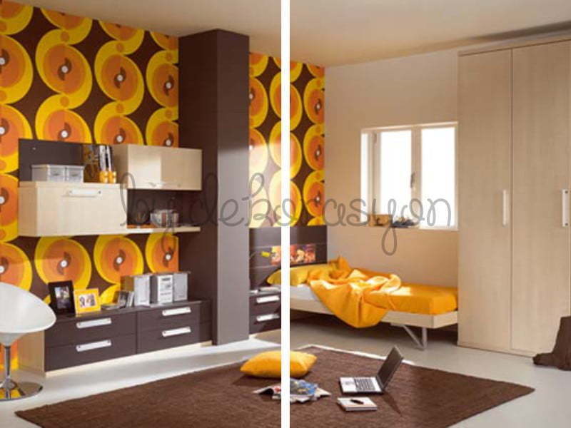 Kahverengi ve turuncu renklerle dekore edilmiş modern bir genç odası