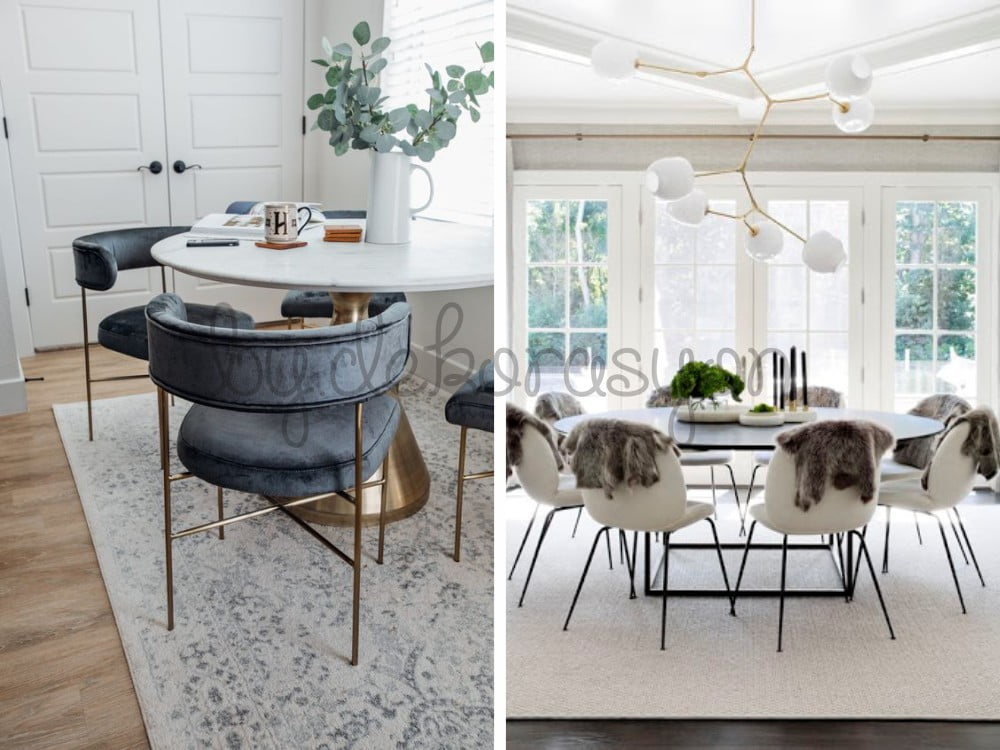 Yemek masasının altına sereceğiniz bir halı, yemek alanını evin diğer bölümlerinden görsel olarak ayırarak tanımlamanın en etkili yoludur. Halı, aynı zamanda mekana renk, desen, doku ve sıcaklık katar. Halı seçerken, boyutunun doğru olduğundan emin olmalısınız. Sandalyeler geri çekildiğinde bile dört ayağının da halının üzerinde kalması gerekir. Bu, genellikle masanın her bir kenarından en az 60 cm daha geniş bir halı anlamına gelir. Temizliği kolay, lekeye dayanıklı ve kısa tüylü bir halı seçmek, yemek alanları için daha pratik bir tercih olacaktır.